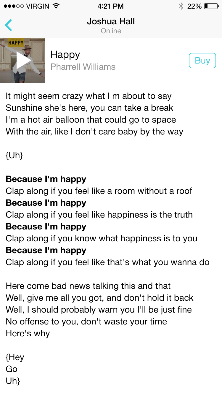 While sending bars to your friends, you might decide you need to hear that tune thats playing in your head. The embed player will allow you to play the song within the app or purchase it.